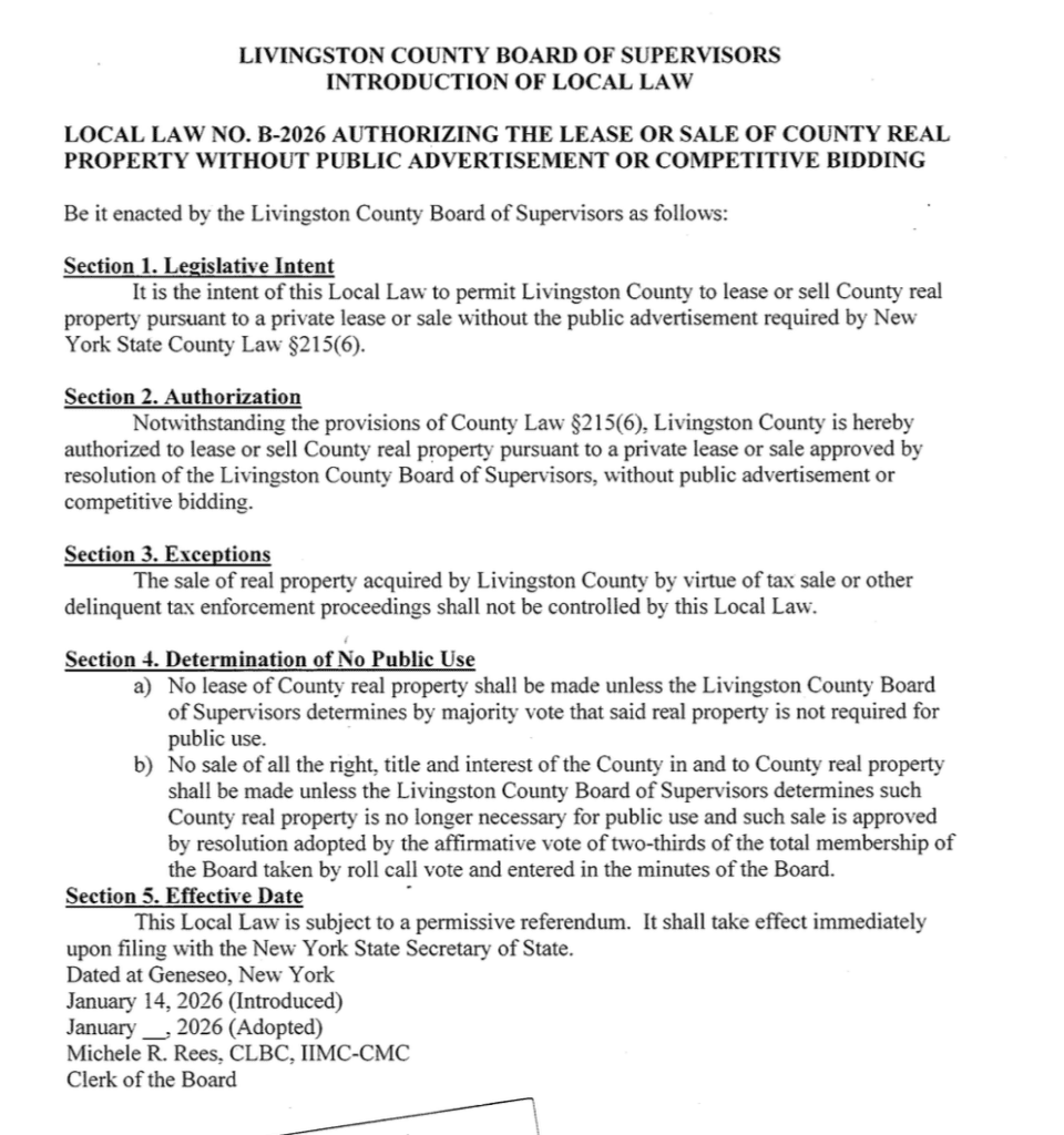 On Wednesday, 2/11/26, the Livingston County Board of Supervisors passed Local Law B-2026. The law was approved by a vote of 10 yeas, 5 nays, 2 Supervisors were absent. Local Law B-2026 gives Livingston County the power to lease or sell public property without the public advertisement that’s required by New York State Law.
