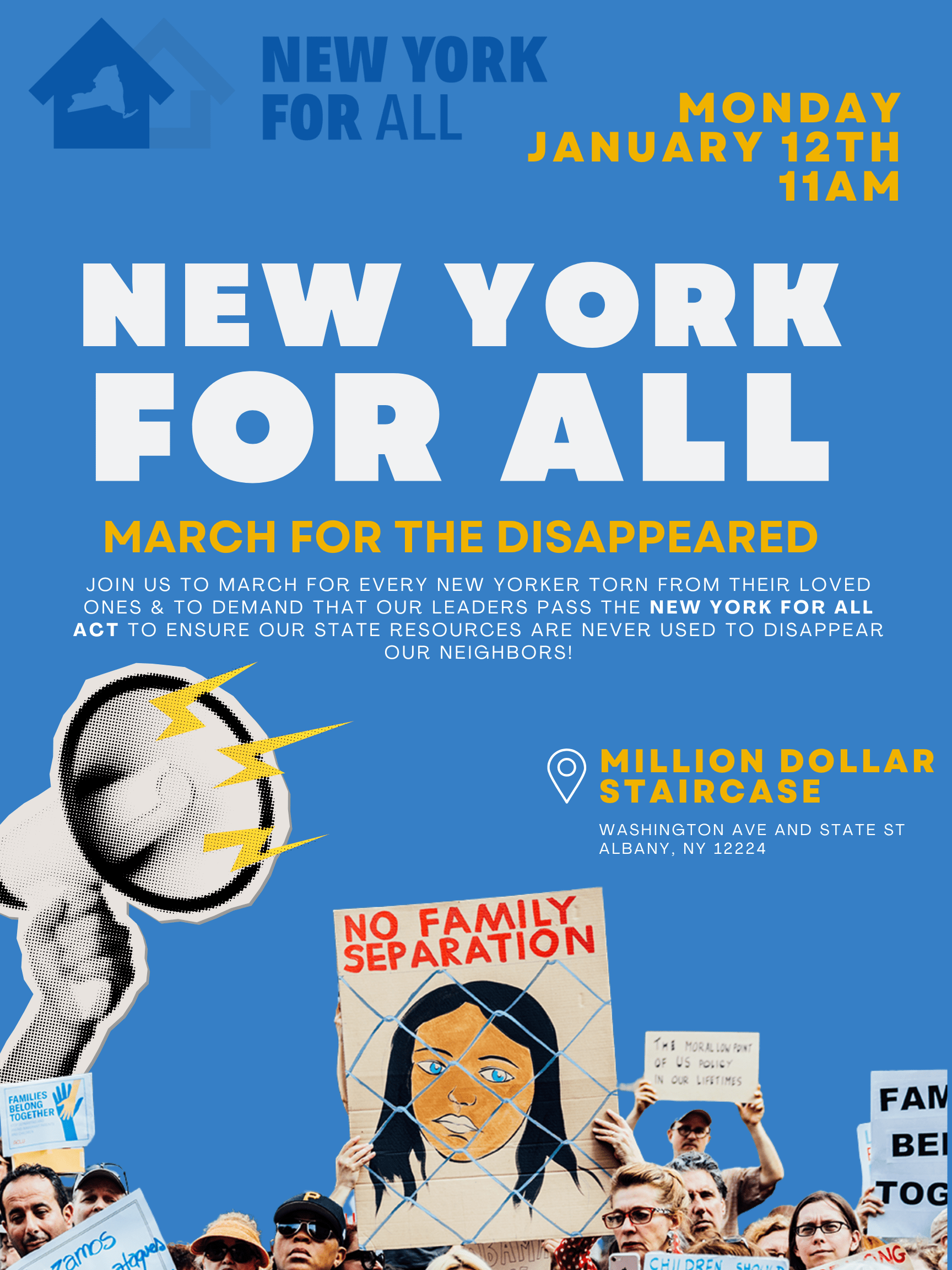 We are marching for every family with an empty space at the dinner table. For every New Yorker ripped away from their loved ones. For every family living in fear that a simple traffic stop on the way to school, work, or the hospital could lead to permanent separation. We are marching to demand that our leaders pass the New York for All Act so state resources are never used to disappear our neighbors.